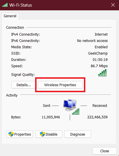 6.Wi-Fi állapotban kattintson a gombraVezeték nélküli tulajdonságok-