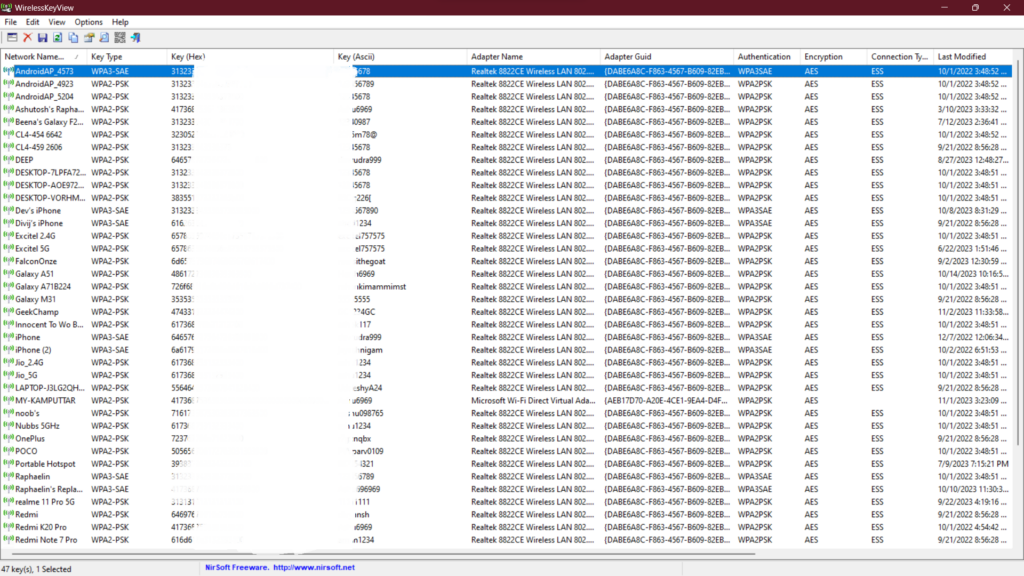 8.Miután az extrahálási folyamat befejeződik, indítsa el aWirelSelSKeyViewAlkalmazás, és megjeleníti az összes Wi-Fi hálózat jelszavát, amelyet valaha a számítógépen használt.