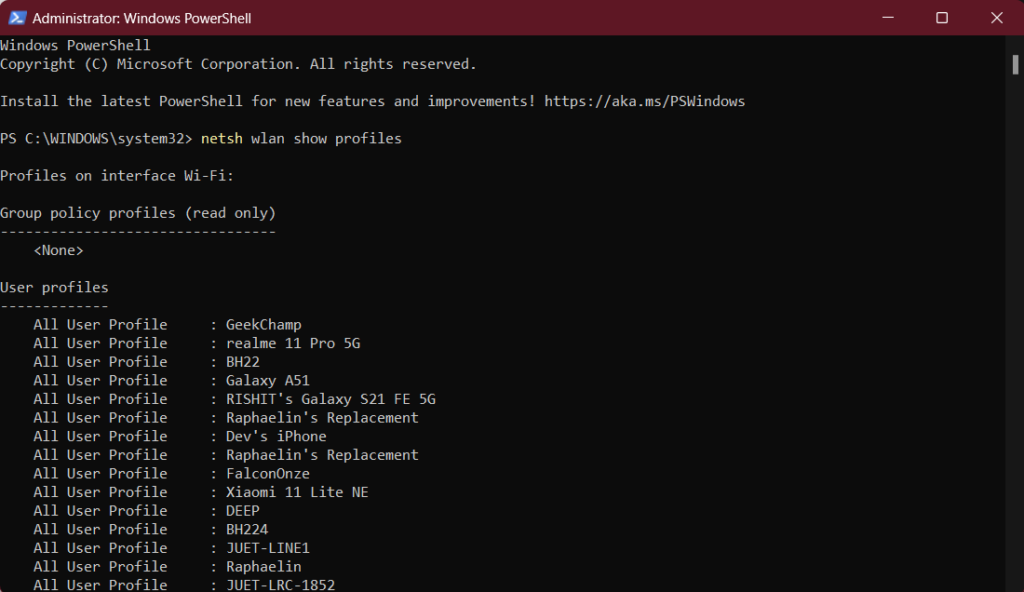 3.Futtassa a következő parancsot aWindows PowerShell, és láthatja az összes Wi-Fi hálózat listáját, amelyet a számítógépen használt.