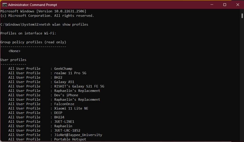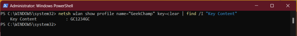 netsh wlan show profile name="GeekChamp" key=clear | find /I "Key Content"5.A parancs végrehajtása után láthatja a jelszót a képernyőnKulcsfontosságú tartalom-