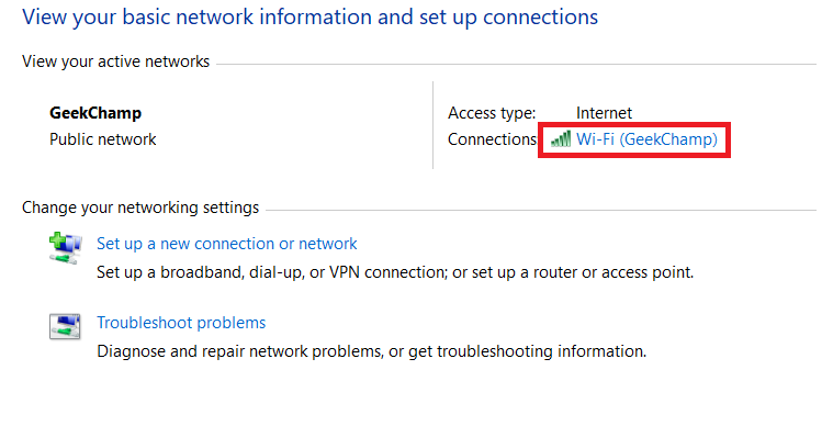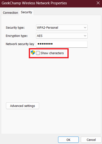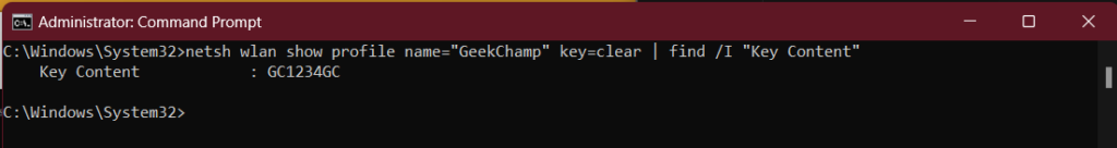 netsh wlan show profile name="GeekChamp" key=clear | find /I "Key Content"5.A parancs végrehajtása után a jelszó a képernyőn lesz, aKulcsfontosságú tartalomszakasz.