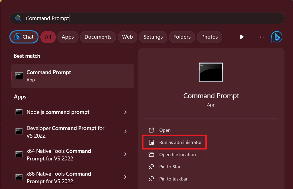 2.KeresParancssorÉs kattintson aFuttasson adminisztrátorkéntopció.