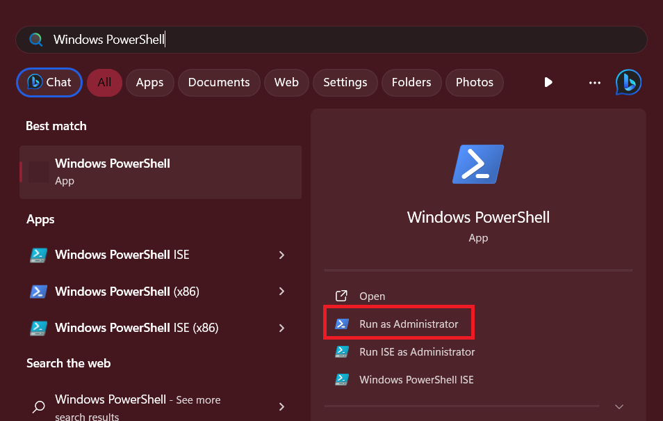 2.KeresWindows PowerShellÉs kattintson a KattintsonFuttasson adminisztrátorkéntopció.