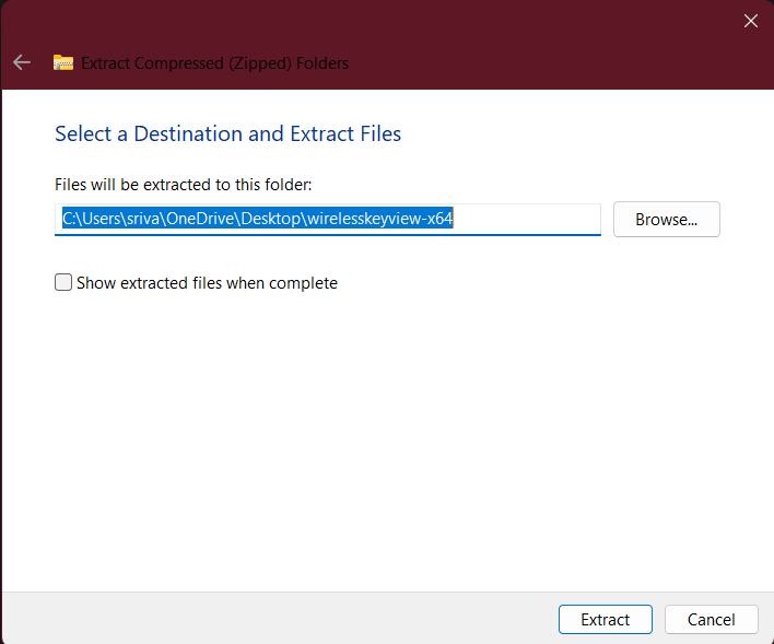 7.Válassza ki azt a helyet, ahol a fájlokat kivonja. A célmappát aBöngészgomb. Ha nem akarja változtatni, kattintson a gombraKivonat-
