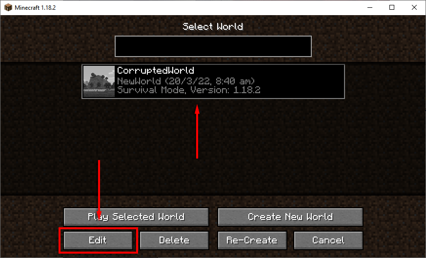 - Válassza ki az eredeti világot, majd kattintsonSzerkesztés.