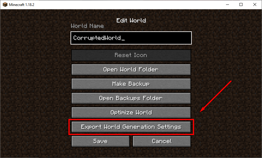 - KattintsonVilággenerációs beállítások exportálása. Ezzel egy .JSON-fájlt exportál a mentési mappába.