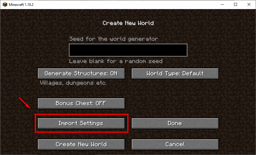 Az első lépés a nyitásMinecraftaz indító segítségével, és hozzon létre egy új világot az eredeti világgal azonos maggal. Ha nincs kéznél a vetőmag, az első javításban található útmutatót követve megtalálhatja.