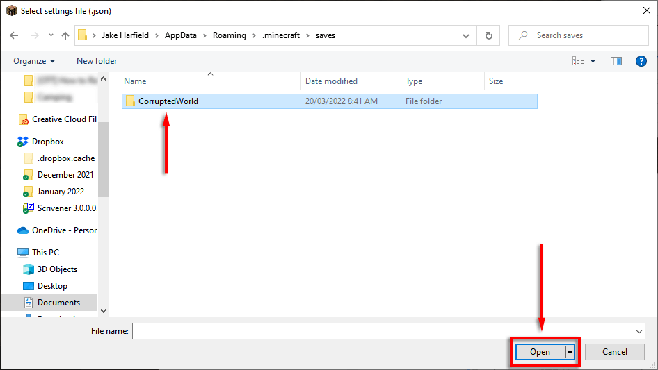 - Nyissa meg a sajátjátCorruptedWorld, válassza ki a fájltworldgen_settings_export.jsonés kattintsonNyitott. Várja meg, amíg létrejön a világ, majd zárja be a Minecraftot.