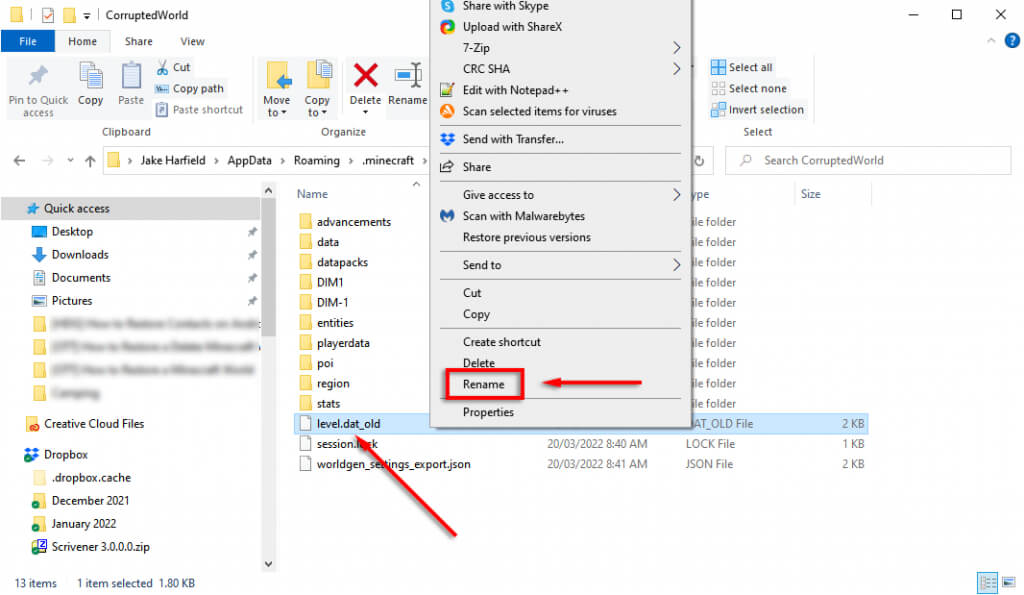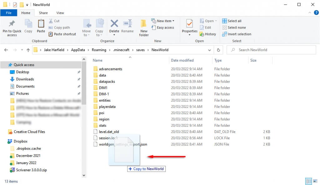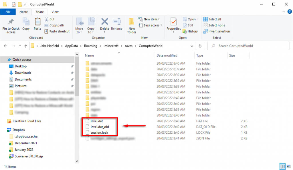 5. Nyissa megCorruptedWorldés találja megszint.dat,level.dat_mcr(nem mindig van jelen),level.dat_old, éssession.lock. Kattintson a jobb gombbal, és másolja/illessze be ezeket a fájlokat az új világ mappájába. A Minecraft Bedrock Edition esetében csak átvitelre van szükségszint.dat.