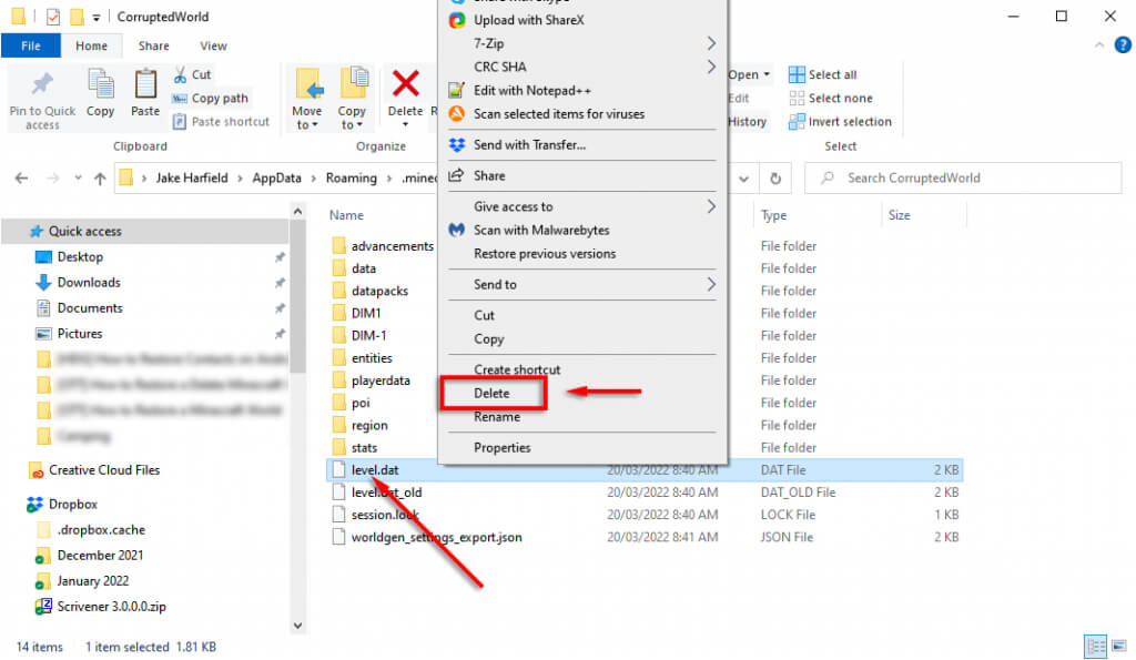 - Keresse meg a fájltszint.datés másolja át egy másik helyre biztonsági másolat létrehozásához. Ezután törölje a fájlt a világ mappából.