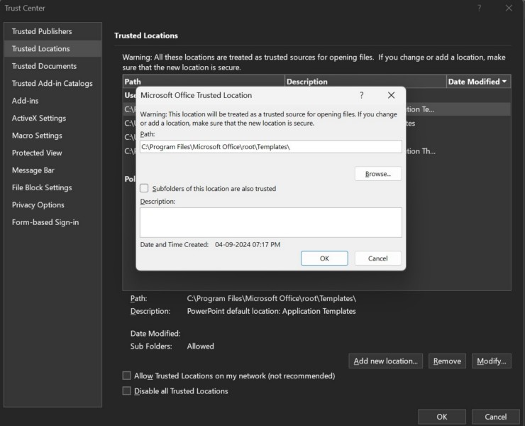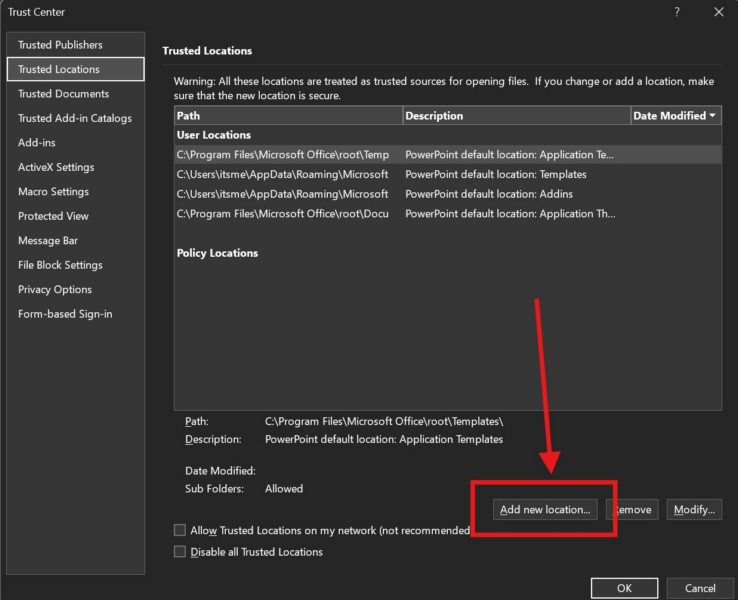 5. Adjon hozzá új helyet a Windows 11 PowerPoint Megbízható helyek listájához