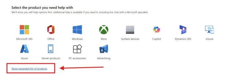 Tehát nyissa meg a hivatalos Microsoft támogatási oldalt a mellékelt hivatkozással az eszköz webböngészőjével. Kattintson aBejelentkezési lehetőséga jobb felső sarokban, hogy bejelentkezzen Microsoft-fiókjába. Most kattintson aA termékek kibővített listájának megjelenítésea lista bővítéséhez.