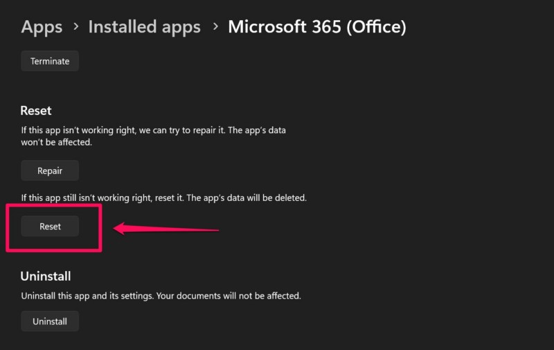 1. Használja az 1-4. lépéseketaz előző résztől ignyissa meg a Speciális beállítások oldalta Windows 11 rendszeren futó Microsoft 365 alkalmazáshoz.