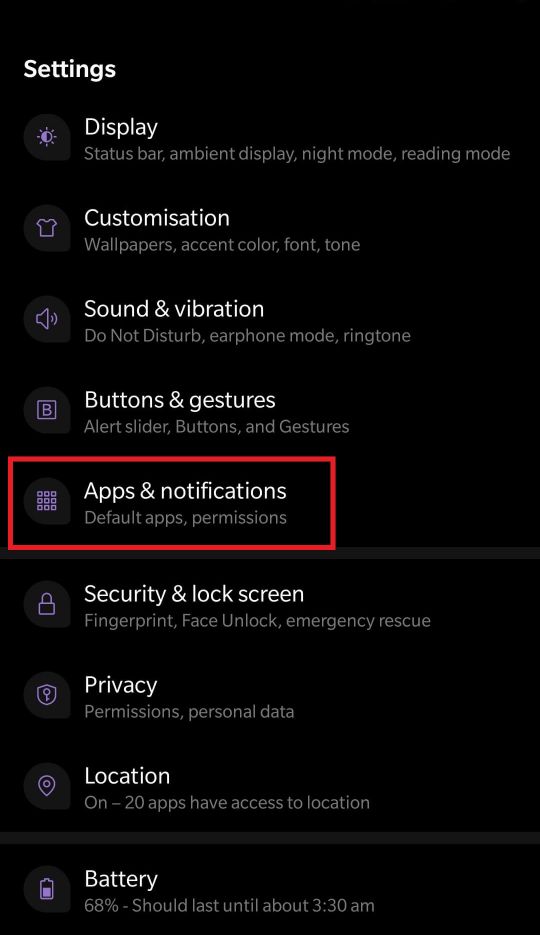 1. lépés:NyitottBeállítások elemreAndroid okostelefonján, és kattintson a gombraAlkalmazások, Alkalmazások és értesítések vagy Alkalmazásokopció.