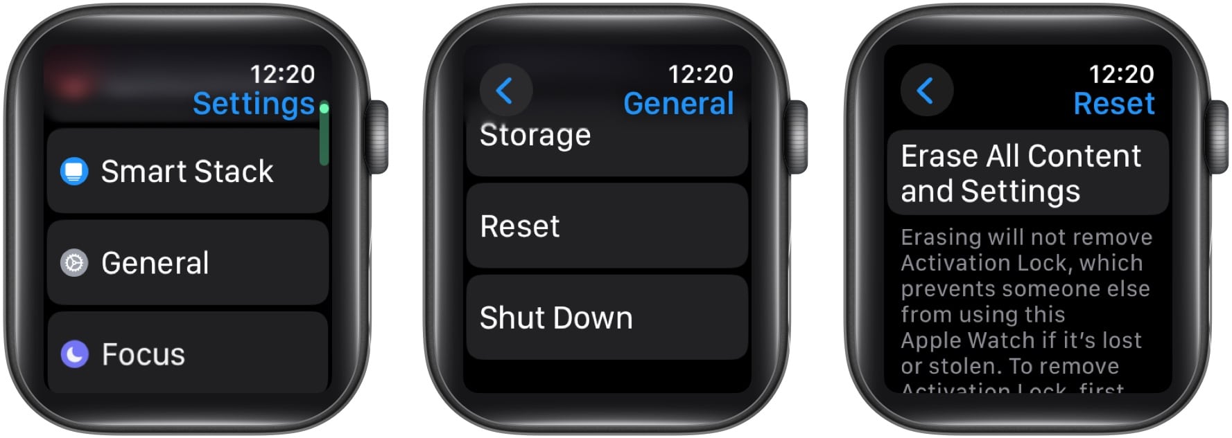 Az Apple Watch gyárának visszaállításához lépjen beBeállítások→Általános→Visszaállítés csapTörölje az összes tartalmat és beállítást- Kövesse a képernyőn megjelenő utasításokat a folyamat befejezéséhez.