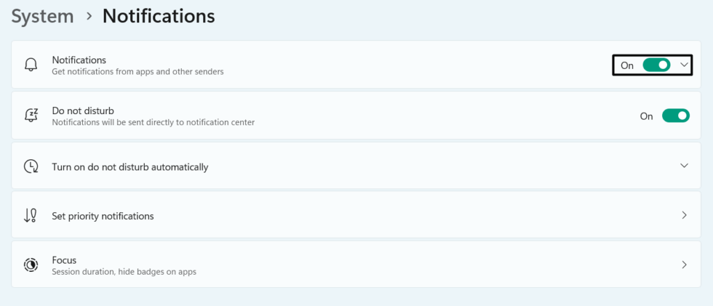 Ha az értesítések engedélyezve vannak a számítógépen, akkor ez lehet az oka ennek a kérdésnek. Ennek oka az, hogy az értesítések folyamatos megjelenéssel megakadályozzák a tálca automatikus elrejtését. Ezért megjelenik az Auto elrejtése, hogy a tálca nem működik. Így,Tiltsa le az értesítéseketegy időre. A PC-n való riasztások letiltásához kövesse az alábbiakban említett lépéseket: