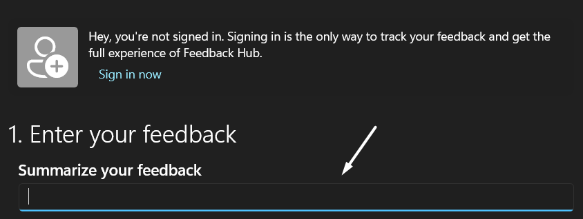 Ha a probléma még akkor sem tűnik el, ha kipróbálta az összes megoldást ebben a hibaelhárítási útmutatóban,Jelentse a kérdést a visszacsatolás központjábanhogy a fejlesztők megvizsgálják és megoldják. Elég könnyű jelenteni egy problémát a visszacsatoló csomópontban, és az alábbiakban magyarázzák ugyanazt: