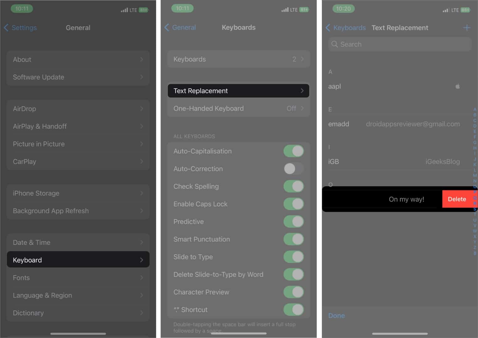 2. Szövegcsere parancsikonok hozzáadása vagy eltávolítása az iPhone készüléken