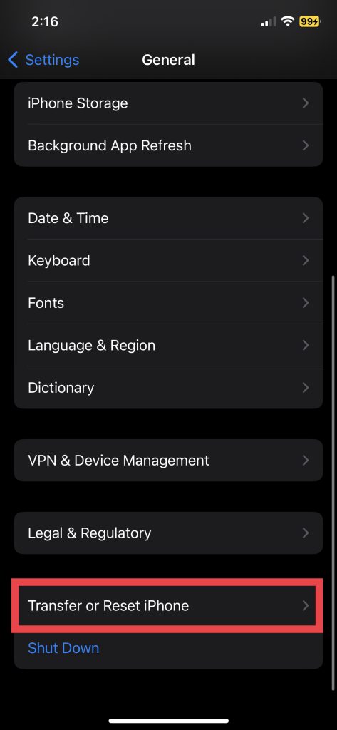 2.Most görgessen le és látogasson elÁtvitel vagy visszaállítás iPhone-