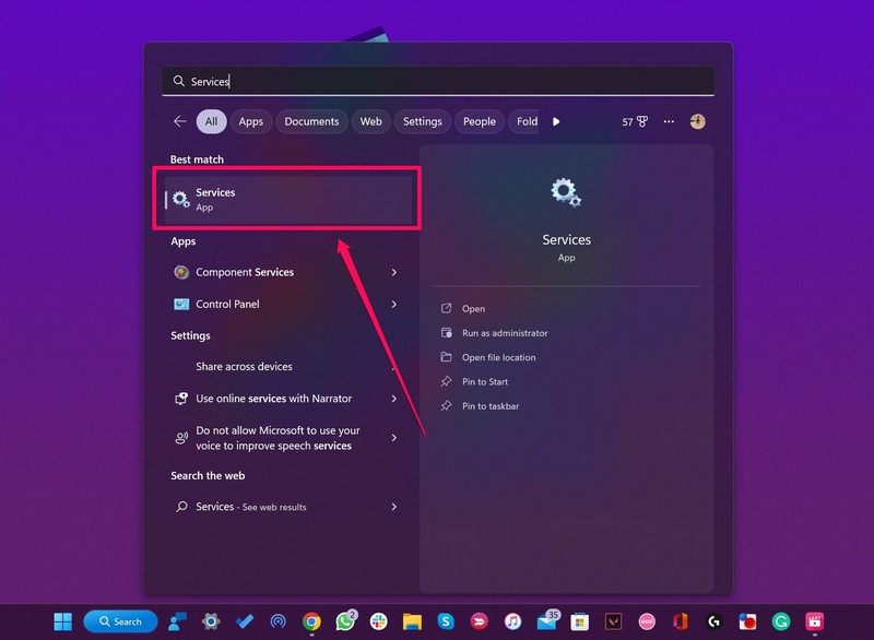 1.Használja a keresési ikont/ sávot aTakihogy kereséseSzolgáltatásA Windows 11 eszközén.