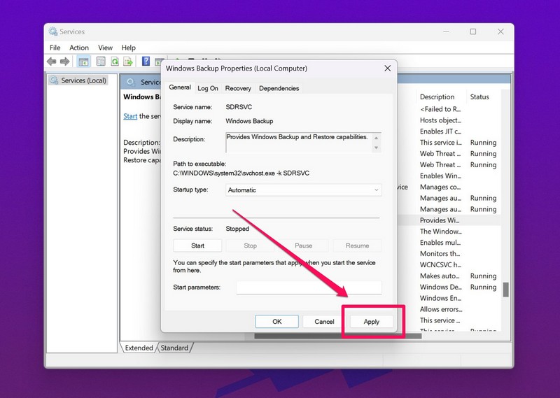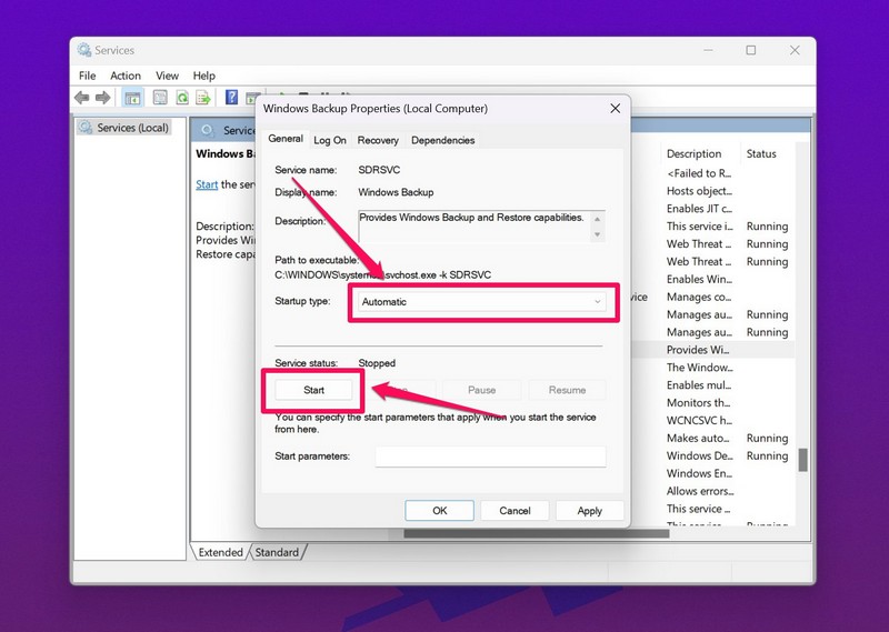 Beállíthatja a szolgáltatást is, hogy automatikusan elinduljon a Windows 11 eszközön, hogy megakadályozza az ilyen problémákat a jövőben. Tehát a Windows biztonsági mentési szolgáltatás kézi elindításához kövesse az alábbi lépéseket: