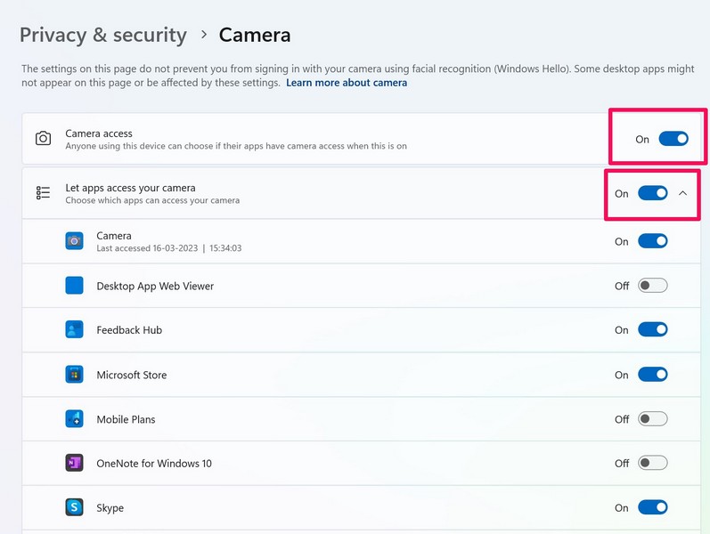A Windows Beállítások alkalmazásban győződjön meg arról, hogy a Kamera-hozzáférés és az Alkalmazások hozzáférésének engedélyezése a kamerához opciók az Adatvédelmi és biztonsági beállításoknál engedélyezve vannak a Windows 11 rendszerben. Ez lehetővé teszi, hogy a Zoom és más alkalmazások hozzáférjenek az eszköz kamerájához vagy bármely más külső webkamerához.