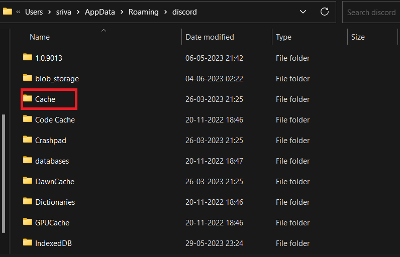 %appdata%discord3.Törölje aGyorsítótármappát, és indítsa újra a Discord alkalmazást.