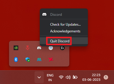 1.Lépjen ki a Discord alkalmazásból, ahogy az első javításnál tettük.