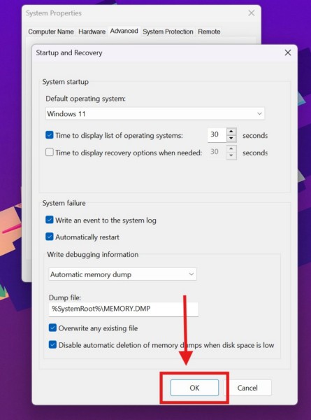 Ezeknek a változásoknak a végrehajtása vagy annak biztosítása, hogy a rendszer meghibásodási beállításait így konfigurálják -e a Windows 11 PC -n vagy a laptopján, biztosítja, hogy a hibás fájlok megfelelően létrejönnek a készüléken. Ez viszont megakadályozza, hogy a „dump fájl létrehozása a dump létrehozása során” hiba miatt meghibásodjon.