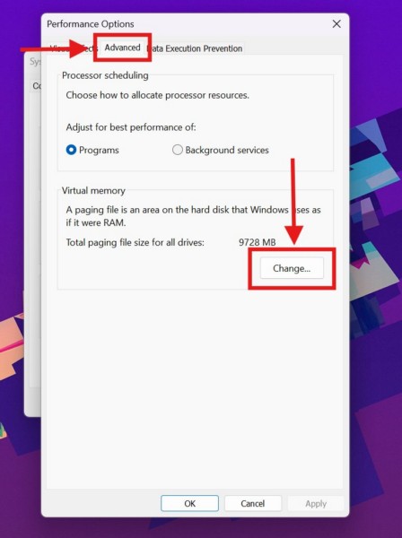 3.ATeljesítménybeállítások ablak, kattintson aHaladó fülfent és válassza ki aVáltozás gombaVirtuális memória szakasz-