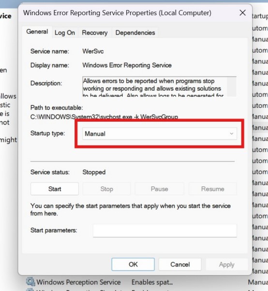 6. Megfelelően konfigurálja a Windows hibajelentési szolgáltatást a Windows 11 -en