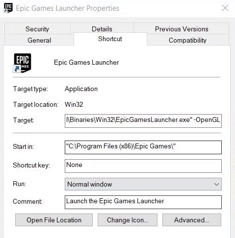 Néhány felhasználó ezt mondtamódosítja az Epic Games Launcher céltulajdonságait parancsikontkijavította a problémát számukra, mivel ezzel megszűnt minden olyan probléma a parancsikonnal kapcsolatban, amelyek megakadályozták a megnyitást.