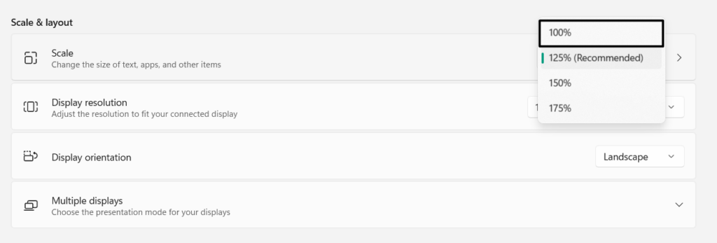 3.Alatt aMéret és elrendezésszakaszban válassza ki a100%opció aSkálalegördülő menüből.