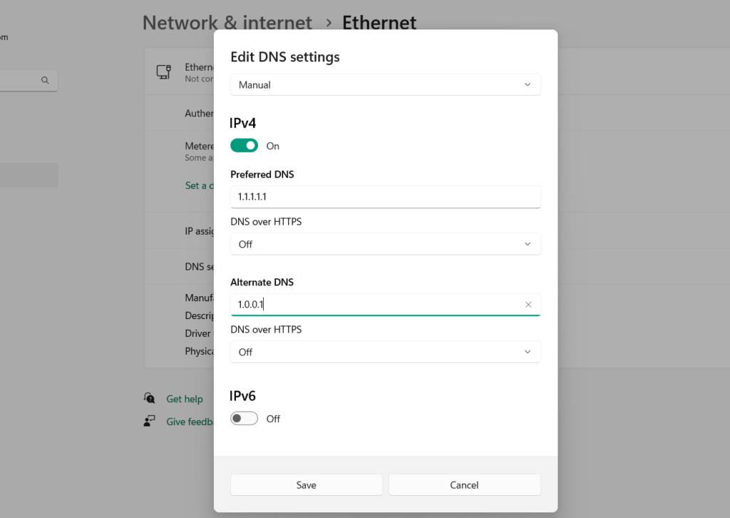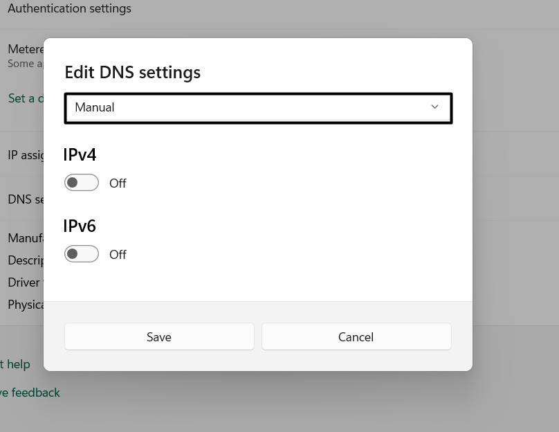 3.ASzerkessze a DNS-beállításokatprompt, válassza kiKézikönyvmenüből, majd engedélyezze aIPv4opció.