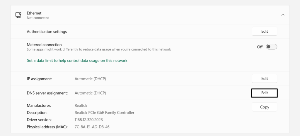 2.Válassza ki aEthernetopciót, majd kattintson a mellette található Szerkesztés gombraDNS-kiszolgáló hozzárendelése.