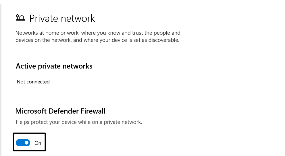 3.Kattintson aPrivát hálózatopciót, majd kapcsolja ki az alatti kapcsolótMicrosoft Defender tűzfal.