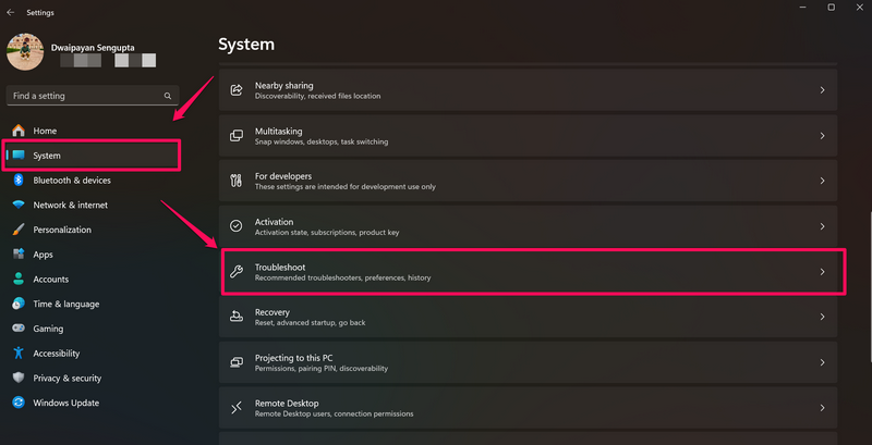 2.ARendszer fülA bal oldali navigációs sávban kattintson aHibaelhárítás opcióA jobb oldali ablaktáblán.