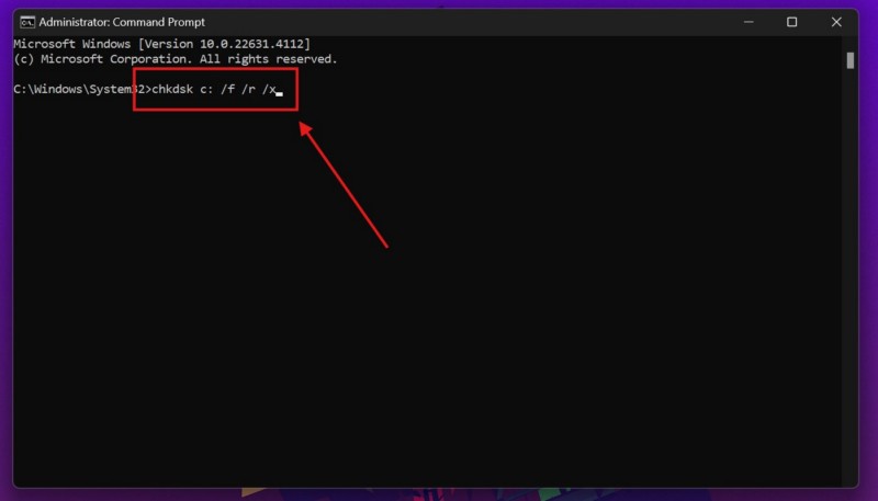chkdsk c: /f /r /xJegyzet:Ha a Windows 11 operációs rendszert a PC -n vagy a laptopon kívüli C -meghajtón kívüli meghajtóba telepítik, cserélje ki a „C” -t a fenti meghajtóhoz kapcsolódó betűvel.
