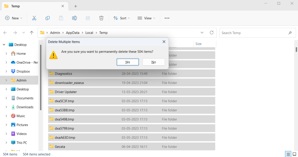 4. Amikor az ideiglenes fájlok megnyílik, válassza ki az összeset, és kattintson a gombraShift + törlés