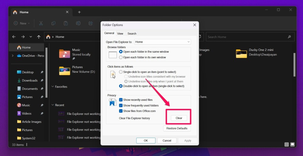 4.A megnyíló következő Mappabeállítások ablakban kattintson aVilágosmelletti gombotA File Explorer előzményeinek törlése, az Adatvédelem részben.