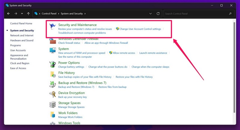 1.NyitottVezérlőpultWindows 11-es eszközén, és kattintson a gombraRendszer és biztonságbeállításokat a tetején.