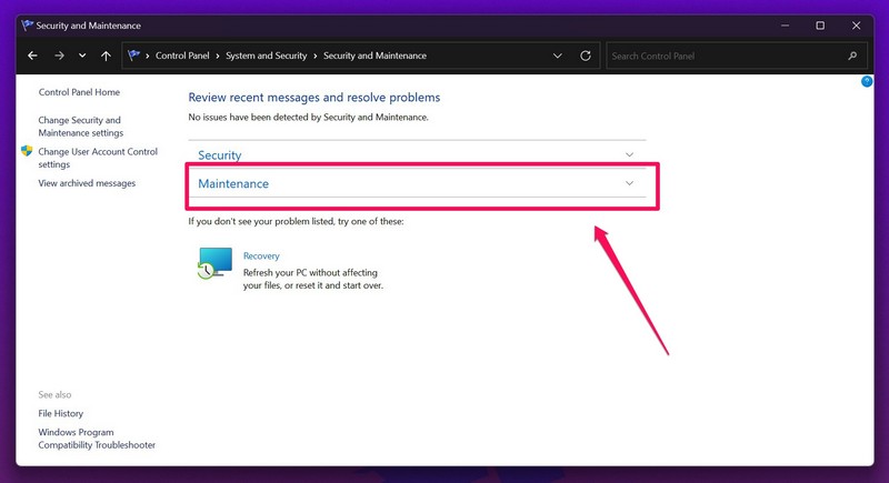 2.Ezután kattintson aBiztonság és karbantartásbeállításokat.