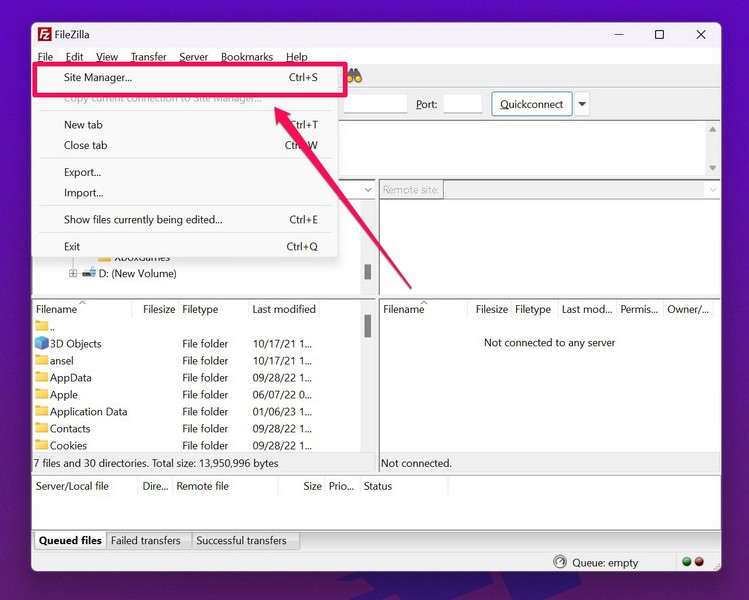 2.A fenti menüsorban kattintson aFájlgombra, majd kattintson a gombraSite Manager.