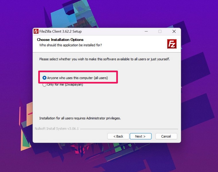 Jegyzet:A telepítési folyamat során a Telepítési beállítások kiválasztása oldalon válassza ki aBárki, aki használja ezt a számítógépet (minden felhasználó)opciót (képernyőkép lentebb). Ezzel az eszköz összes felhasználója használhatja a FileZillát, nem csak a rendszergazda.