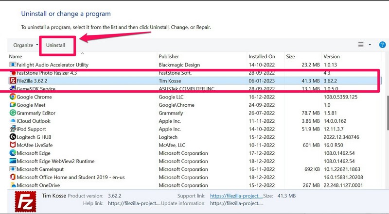 4.Ezután válassza ki a FileZillát, és kattintson a gombraEltávolításgomb. Kövesse a képernyőn megjelenő utasításokat a program eltávolításához.