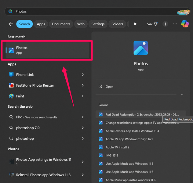 4.Ezután a Windows + S használatával nyissa meg a Windows keresést, keresse meg aFotóalkalmazás, ésKattintson rá az újraindításhoz-