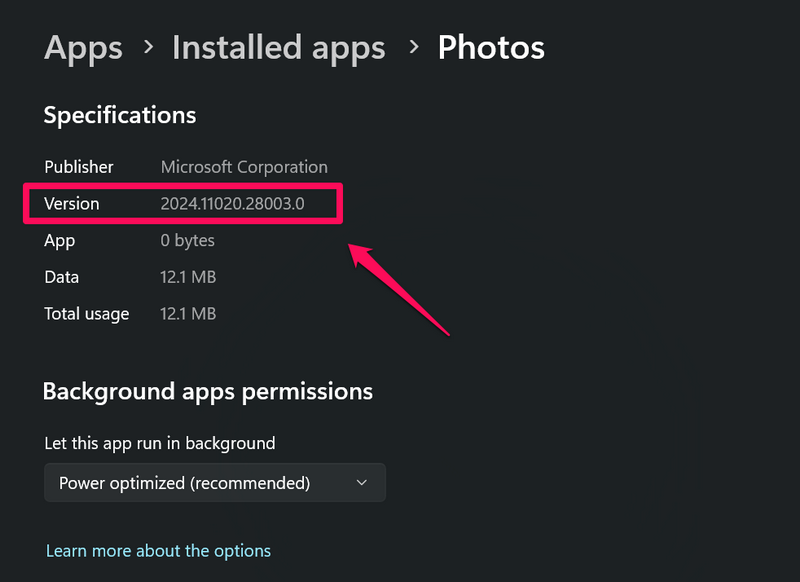 3.A következő oldalon győződjön meg arról, hogy aVerziószámaz2024.11020.21001.0 vagy Higher. Ha frissül, akkor folytathatja a következő javítást. Ha nem, akkor folytathatja a következő lépéseketFrissítse a Fotók alkalmazástA Windows 11 eszközén.