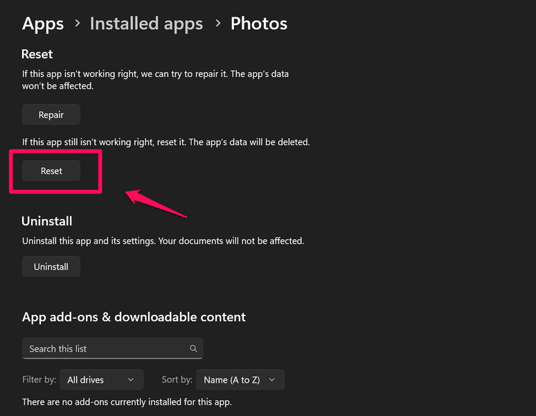 8.Ha folytatja a problémák tapasztalatait, akkor visszatérhet aSpeciális beállítások oldala Photos alkalmazáshoz, és nyomja meg aVisszaállítási gombezúttal. Érdemes megjegyezni, hogy az alkalmazás visszaállítása törli az összes alkalmazás adatait a számítógépről vagy a laptopról.