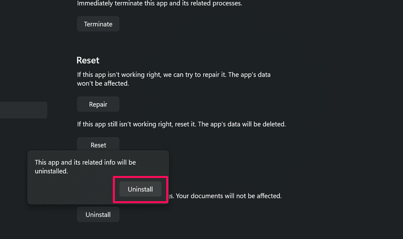 Ha az erővel záródó trükk nem oldotta meg a Generative törlés nem működését a Windows 11 Photos alkalmazásban, akkor megpróbálhatja megjavítani és/vagy visszaállítani az alkalmazást a számítógépen vagy a laptopján. A javítási és visszaállítási eszközök beépítve vannak a Microsoft Store alkalmazásokhoz, amelyek lehetővé teszik a felhasználók számára, hogy könnyen elhárítsák őket, és megszabaduljanak az alkalmazáson belüli problémáktól.