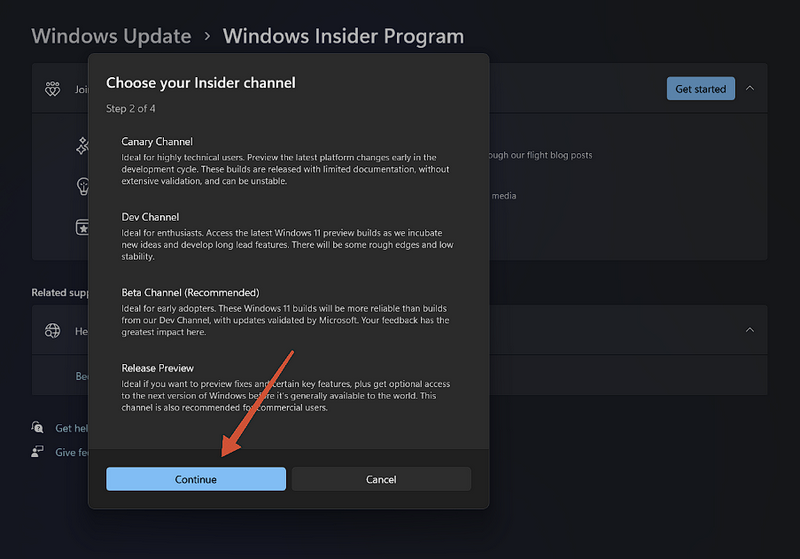 5.Miután a Microsoft -fiókot összekapcsolta a Windows Insider programmal, válassza aBéta -csatornaÉs kattintson aFolytatódikgomb. Bár a Windows bennfentes csatornát választhatja, aBéta -csatornaaz ajánlott választás, és szinténA generatív törlő eszköz a béta -csatornán érhető el-